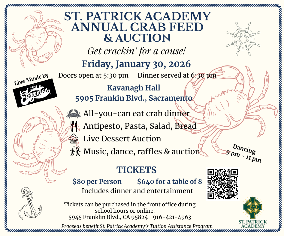 St. Patrick Academy, a culturally diverse diocesan regional school, serves students in the South Sacramento area and the surrounding communities. The ministry of the Academy is threefold: to provide a positive, Christ-centered, 21st-century learning experience through excellence in academics; to be attentive to all aspects of the individual child's development; and to provide students with the tools to be self-motivated, critical thinkers. The modeling and practice of moral and ethical values, coupled with the teachings of our Catholic faith, further empower our students to meet all future challenges. Aiding parents in their responsibility as the primary educators of their children, the Academy strives to honor and celebrate our ethnic and spiritual diversity while preparing our students to be bearers of compassion, respect, and knowledge to the larger world.